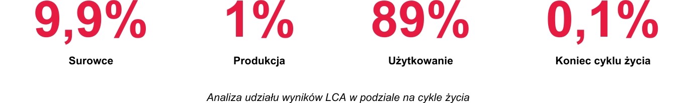 Największy wpływ na końcowy wynik ma zużycie energii elektrycznej podczas eksploatacji, dlatego przeprowadziliśmy analizę wrażliwości energii elektrycznej na etapie użytkowania, aby zrozumieć, jak zmiana lokalizacji użytkowania produktu może wpłynąć na ogólny rezultat.
